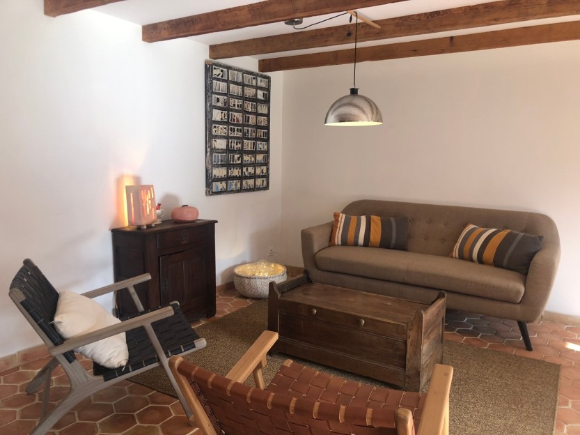Dehors, tout est là : la terrasse en pierre, l’étang à quelques mètres, la piscine à deux pas, les chemins familiers du domaine. Les enfants partent voir les chèvres, jouent dans l’herbe ou attrapent des têtards. Les adultes se croisent lisent au soleil, préparent un repas ou accompagnent les enfants attraper les têtards et donner quelques morceaux de pains aux ânes. Le quotidien prend un autre rythme, plus simple, plus souple.