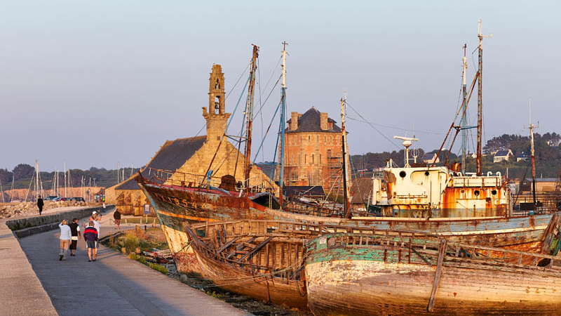 A l’extrême ouest de la presqu’île, Camaret est un port typique où il fait bon flâner sur les quais animés, bordés de maisons colorées. Sur la jetée, la chapelle Notre-Dame de Rocamadour est célèbre pour ses maquettes de bateaux déposés là en guise d’ex-votos. La balade se prolonge jusqu’à la tour Vauban, dite « tour dorée » en raison de sa teinte ocre. Pour une vision romantique, il faut se tourner vers le cimetière marin où des silhouettes de bateaux reposent sur la grève.